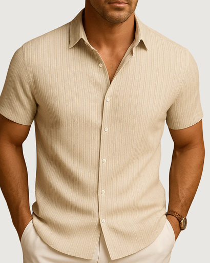 Cette chemise légère pour homme est confectionnée dans un tissu respirant à texture discrète. Avec son col classique et ses manches courtes, elle est idéale pour les journées chaudes ou un look décontracté chic. À porter avec un chino ou un short pour un style soigné sans effort.