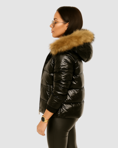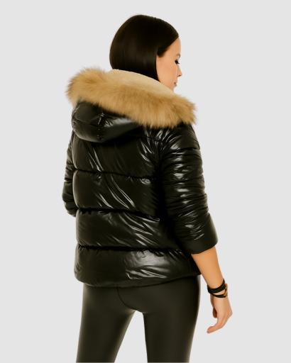 Doudoune Femme Brillante avec Capuche Fourrée – Élégance et Chaleur
