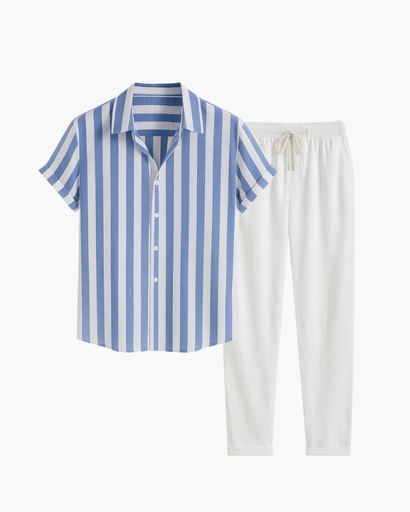 Cet ensemble estival associe une chemise légère à manches courtes à rayures verticales et un pantalon droit fluide à taille élastique. Idéal pour une journée décontractée ou une soirée d’été, ce look offre confort et raffinement dans un style épuré. La coupe droite et les matières légères assurent une allure soignée sans effort.