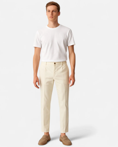 Design : Coupe classique, plis sur le devant, ourlet net