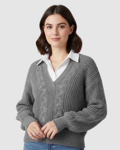 Pull Femme à Col V – Maille Torsadée & Coupe Confort