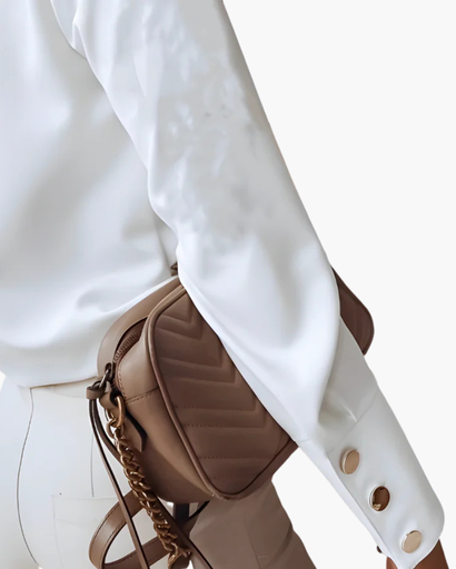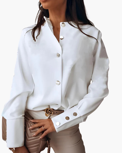 Top moderne avec fermeture boutonnée en diagonale, col montant et poignets larges ornés de boutons métalliques. Idéal pour une tenue chic ou professionnelle.