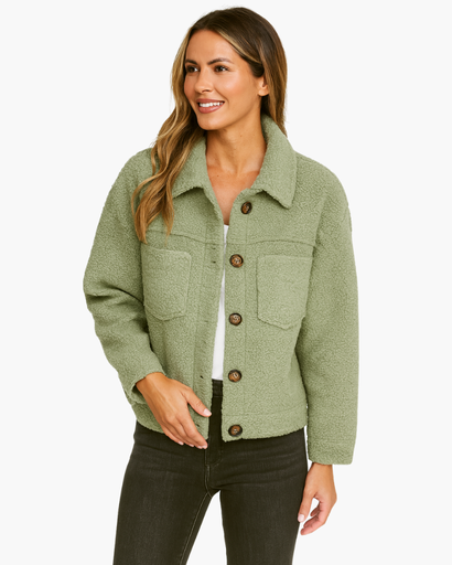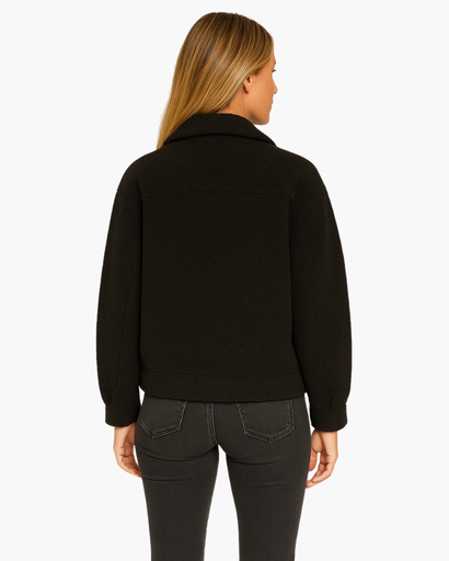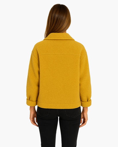 Cette veste en laine bouclée allie confort et tendance pour la mi-saison.