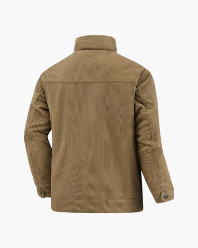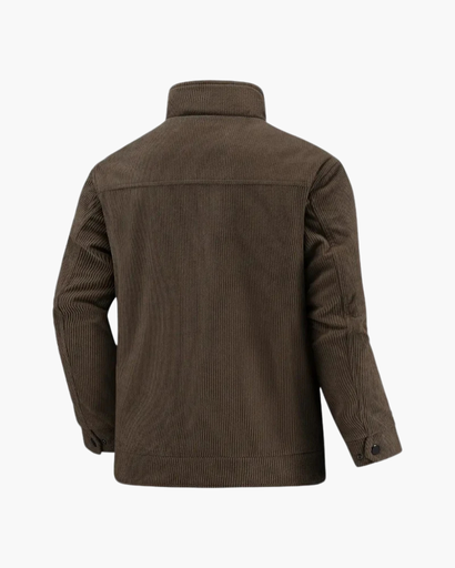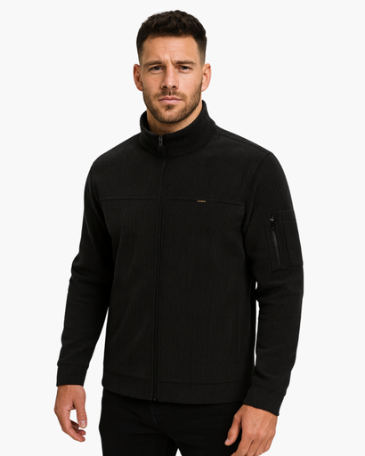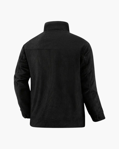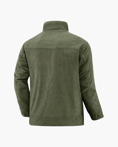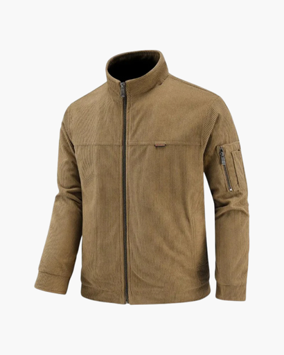 Veste en velours côtelé au design moderne, dotée d’une fermeture zippée sur le devant et d’un col montant. Un modèle fonctionnel avec poches discrètes et une poche zippée sur la manche, offrant une allure élégante et contemporaine.
